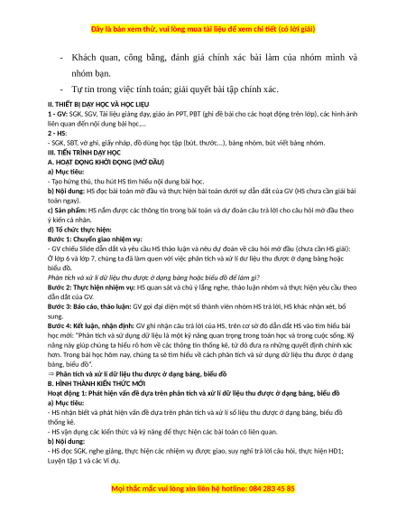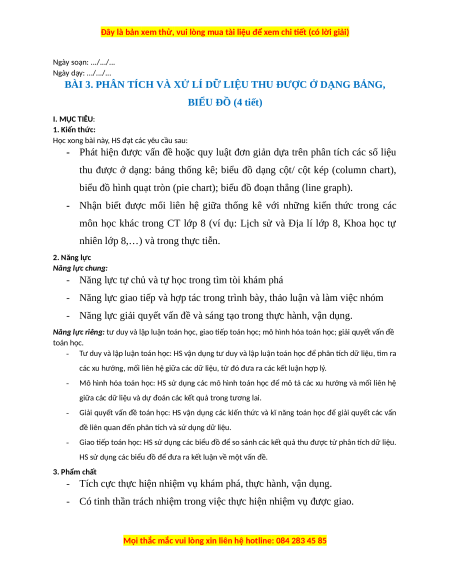 BÀI 3. PHÂN TÍCH VÀ XỬ LÍ DỮ LIỆU THU ĐƯỢC Ở DẠNG BẢNG, BIỂU ĐỒ (4 tiết) I. MỤC TIÊU: 1. Kiến thức: