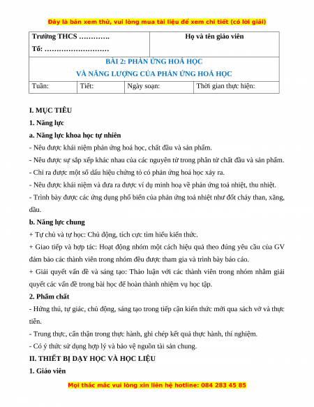 VÀ NĂNG LƯỢNG CỦA PHẢN ỨNG HOÁ HỌC Tuần: Tiết: Ngày soạn: Thời gian thực hiện: I. MỤC TIÊU 1. Năng lực
