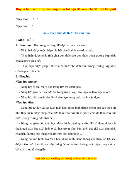 Bài 5. Phép chia đa thức cho đơn thức I. MỤC TIÊU