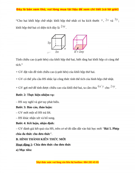 Giáo án Phép chia đa thức cho đơn thức Toán 8 Kết nối tri thức