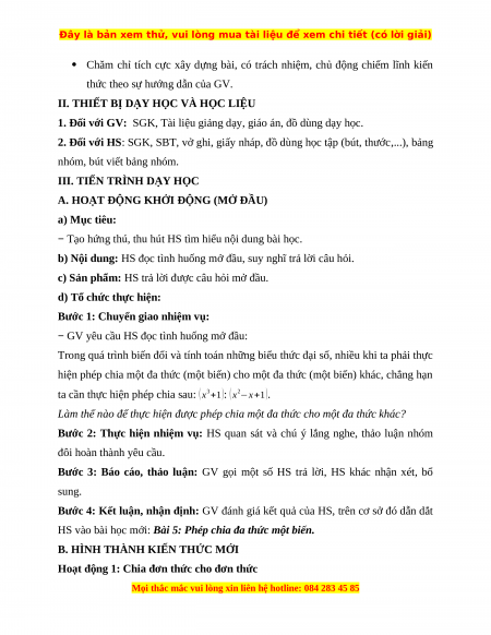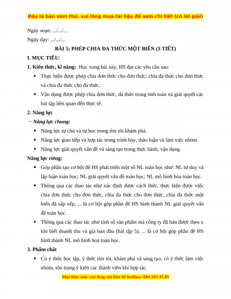 BÀI 5: PHÉP CHIA ĐA THỨC MỘT BIẾN (3 TIẾT) I. MỤC TIÊU: