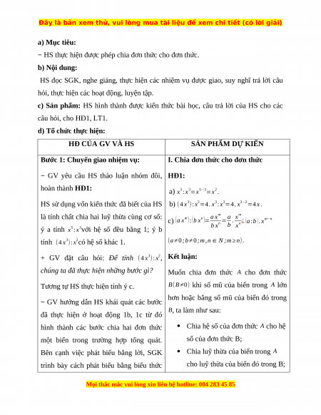 − HS thực hiện được phép chia đơn thức cho đơn thức. b) Nội dung: