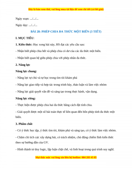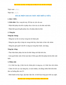 BÀI 28: PHÉP CHIA ĐA THỨC MỘT BIẾN (3 TIẾT) I. MỤC TIÊU: