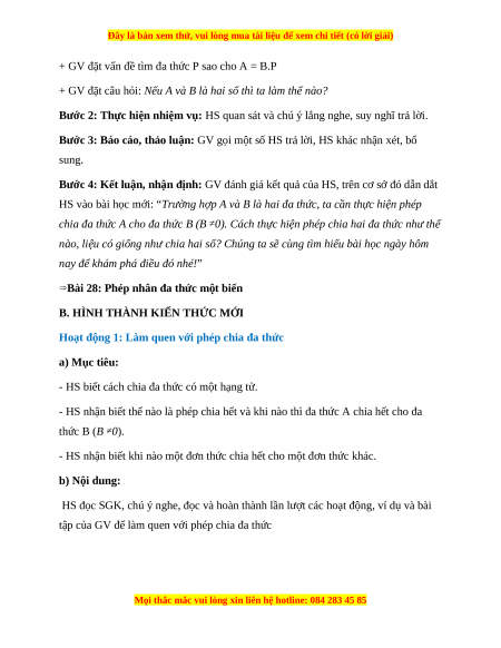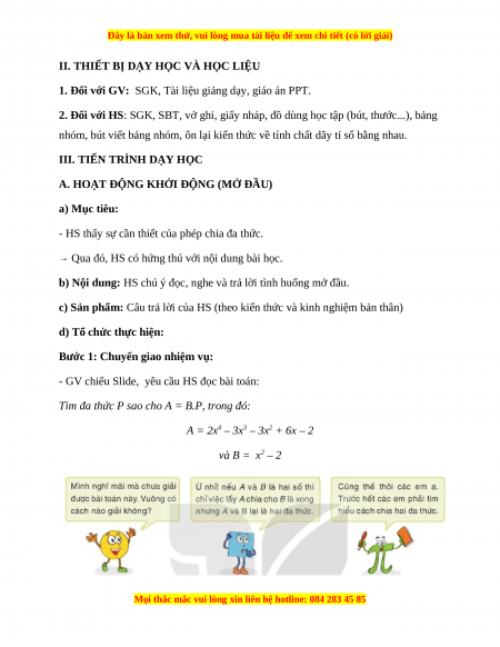 Hoạt động 1: Làm quen với phép chia đa thức a) Mục tiêu:
