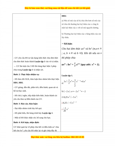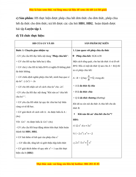 hết đa thức cho đơn thức; trả lời được các câu hỏi HĐ1, HĐ2, hoàn thành được