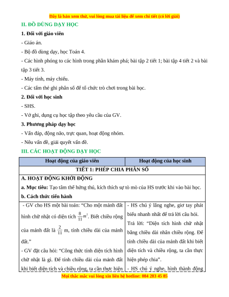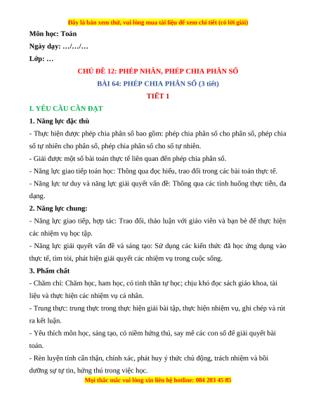 - Củng cố về phép chia phân số qua tình huống thực tế, giúp HS phát triển năng lực giải quyết vấn đề.