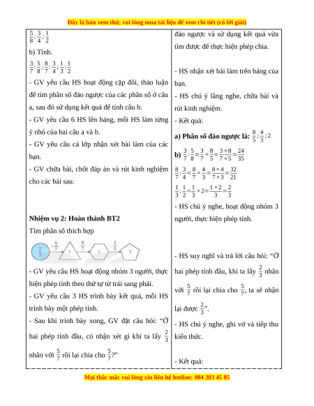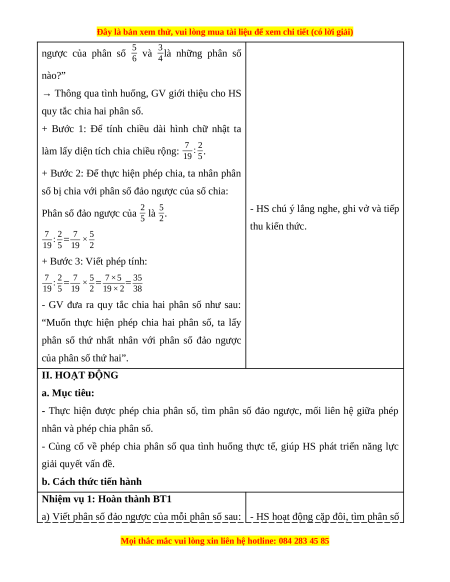 phân số thứ nhất nhân với phân số đảo ngược của phân số thứ hai”. II. HOẠT ĐỘNG a. Mục tiêu: