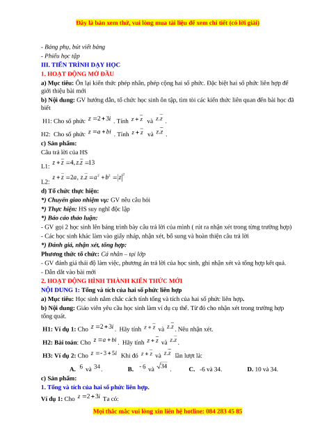 a) Mục tiêu: Ôn lại kiến thức phép nhân, phép cộng hai số phức. Đặc biệt hai số phức liên hợp để