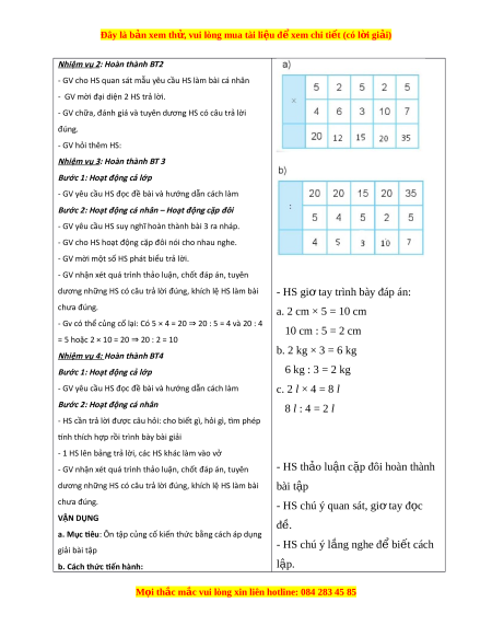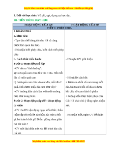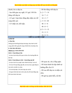 Đây là bản xem th , vu ử i lòng mua tài li u ệ đ xe ể m chi ti t (c ế ó l i ờ gi i ả ) 2. Đ i ố v i ớ h c s ọ inh: V ghi ở , sgk, d ng c ụ h ụ c t ọ p. ậ III. TI N Ế TRÌNH D Y Ạ H C Ọ HOẠT Đ N Ộ G C A Ủ GV HOẠT Đ N Ộ G C A Ủ HS TIẾT 1: PHÉP CHIA I. KHÁM PHÁ a. Mục tiêu: - T o t ạ âm th h ế ng t ứ hú cho HS và t ng ừ bư c ớ làm quen bài h c. ọ - HS nh n bi ậ t ế phép chia, bi t ế cách vi t ế phép chia b. Cách th c ứ ti n hàn ế h: - HS nghe GV gi i ớ thi u ệ
