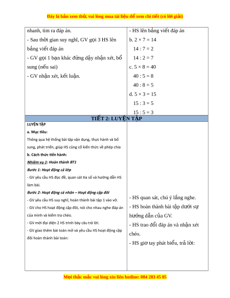 Đây là bản xem th , vu ử i lòng mua tài li u ệ đ xe ể m chi ti t (c ế ó l i ờ gi i ả ) nhanh, tìm ra đáp án. - HS lên b ng ả vi t ế đáp án - Sau th i ờ gian suy nghĩ, GV g i ọ 3 HS lên b. 2 × 7 = 14 b ng ả vi t ế đáp án 14 : 7 = 2 - GV g i ọ 1 b n khác ạ đ ng d ứ y nh ậ n ậ xét, b ổ 14 : 2 = 7 sung (n u ế sai) c. 5 × 8 = 40 - GV nh n xét ậ , k t ế lu n. ậ 40 : 5 = 8 40 : 8 = 5 d. 5 × 3 = 15 15 : 3 = 5 15 : 5 = 3 TI T Ế 2: LUY N Ệ T P Ậ LUYỆN TẬP a. Mục tiêu: