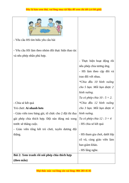 - Thực hiện hoạt động rồi nêu phép chia tương ứng.