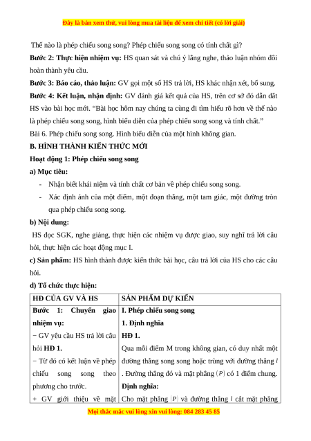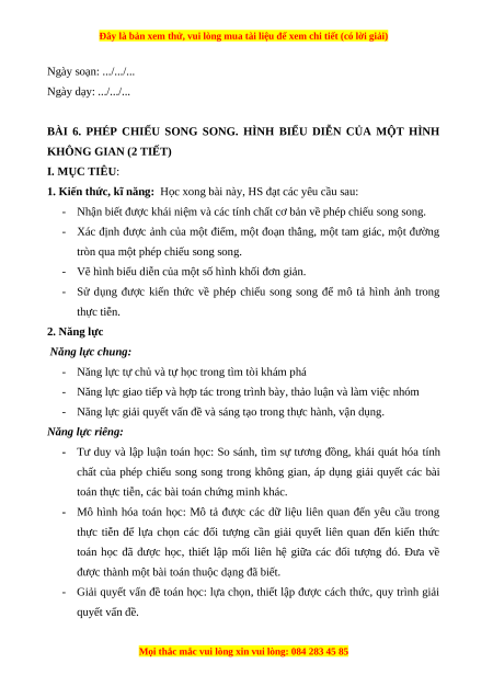 BÀI 6. PHÉP CHIẾU SONG SONG. HÌNH BIỂU DIỄN CỦA MỘT HÌNH KHÔNG GIAN (2 TIẾT) I. MỤC TIÊU: