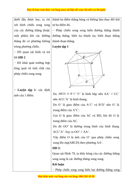 - Nhận biết khái niệm và tính chất cơ bản về phép chiếu song song.