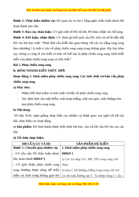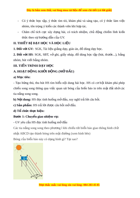 ụ HS quan sát và chú ý l n ắ g nghe, th o ả lu n ậ nhóm đôi hoàn thành yêu c u ầ . Bư c ớ 3: Báo cáo, th o ả lu n: ậ GV g i ọ m t ộ s ố HS tr ả l i ờ , HS khác nh n ậ xét, b ổ sung. Bư c ớ 4: K t ế lu n, ậ nh n ậ đ nh: ị GV đánh giá k t ế qu ả c a ủ HS, trên c ơ s ở đó d n ẫ d t ắ HS vào bài h c ọ m i ớ : “Hình n ả h c a ủ bi n ể báo giao thông v i ớ các tia n n ắ g song song theo ph n ươ g l là m t ộ ví dụ về phép chi u