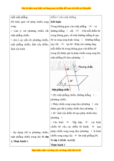 HS khái quát về phép chi u ế song Kết luận song. Trong không gian, cho m t ặ ph n ẳ g (P) và + L u ư ý: xét ph n ươ g chi u ế c t ắ đ n ườ g th n ẳ g l c t ắ (P) . V i ớ m i ỗ đi m ể M m t ặ ph n ẳ g chi u ế . trong không gian, v ẽ m t ộ đ n ườ g th n ẳ g đi qua + chú ý các y u ế t : ố ph n ươ g chi u ế , M và song song ho c ặ trùng l. Đ n ườ g th n ẳ g m t ặ ph n ẳ g chi u ế , n ả h c a ủ đi m, ể này c t ắ (P) t i ạ M’. Phép cho t n ươ g n ứ g n ả h c a ủ hình. m i ỗ đi m ể M trong không gian v i ớ đi m ể M’ trong (P) đ c ượ g i ọ là phép chi u ế song song lên m t ặ ph n ẳ g (P) theo ph n ươ g l. + (P): m t ặ ph n ẳ g chi u ế , đ n ườ g th n ẳ g l : ph n ươ g chi u ế . + Phép chi u ế song song theo ph n ươ g l còn đ c ượ g i ọ t t ắ là phép chi u ế theo ph n ươ g l. + M’: n ả h c a ủ đi m ể M qua phép chi u ế theo ph n ươ g l. - Cho hình H . T p ậ h p ợ H ' các hình chi u ế M’ c a ủ các đi m ể M thu c ộ H qua - Áp d n ụ g chỉ ra ph n ươ g chi u ế , phép chi u ế song song theo ph n ươ g l là hình m t ặ ph n ẳ g chi u