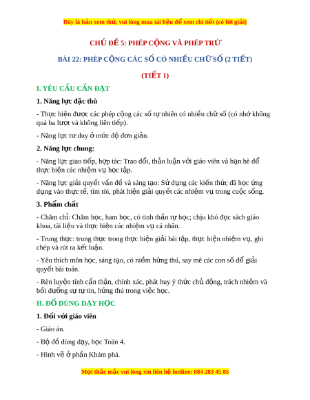 Đây là bản xem th , vu ử i lòng mua tài li u ệ đ xe ể m chi ti t (c ế ó l i ờ gi i ả ) CH Đ Ủ Ề 5: PHÉP C N Ộ G VÀ PHÉP TRỪ BÀI 22: PHÉP C N Ộ G CÁC S C Ố Ó NHI U Ề CH S Ữ ( Ố 2 TI T Ế ) (TIẾT 1)