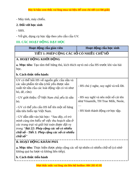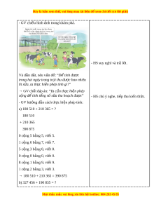 Đây là bản xem th , vu ử i lòng mua tài li u ệ đ xe ể m chi ti t (c ế ó l i ờ gi i ả ) - Máy tính, máy chi u. ế 2. Đ i ố v i ớ h c s ọ inh - SHS. - Vở ghi, d ng c ụ h ụ c ọ t p t ậ heo yêu c u c ầ a ủ GV. III. CÁC HO T Ạ Đ N Ộ G D Y Ạ H C Ọ Hoạt đ ng c ộ a gi ủ áo viên Hoạt đ ng c ộ a h ủ c s ọ inh TI T Ế 1: PHÉP C N Ộ G CÁC S C Ố Ó NHI U Ề CH S Ữ Ố A. HOẠT Đ N Ộ G KH I Ở Đ N Ộ G a. Mục tiêu: T o t ạ âm th h ế ng t ứ