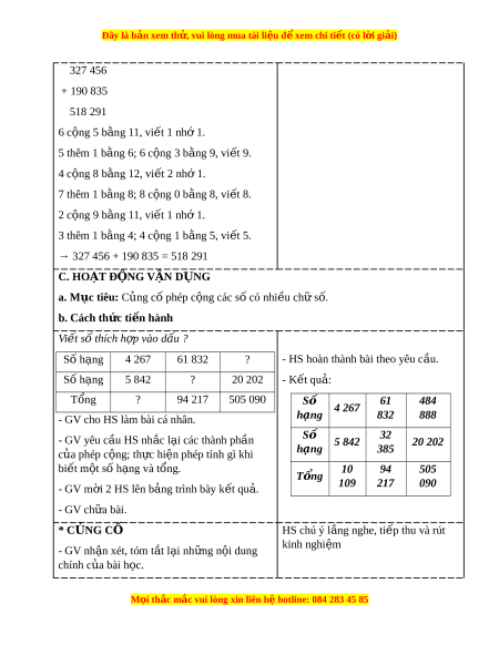 → 327 456 + 190 835 = 518 291 C. HOẠT Đ N Ộ G VẬN D N Ụ G a. Mục tiêu: C ng c ủ ố phép c ng ộ các số có nhi u ch ề s ữ ố. b. Cách th c t ứ i n hành ế Vi t