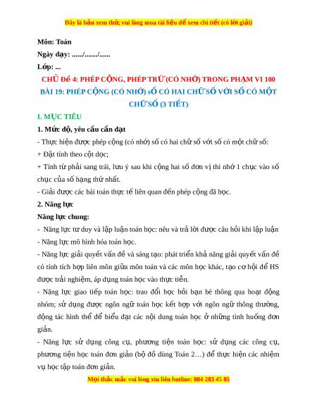 Ộ G, PHÉP TRỪ (CÓ NH ) Ớ TRONG PH M Ạ VI 100 BÀI 19: PHÉP C N Ộ G (CÓ NH ) Ớ s C Ố Ó HAI CH S Ữ Ố V I Ớ S C Ố Ó M T Ộ CH S Ữ ( Ố 3 TIẾT) I. M C Ụ TIÊU 1. Mức đ , ộ yêu c u c ầ n đ ầ t ạ - Th c hi ự n đ ệ ư c ợ phép c ng ( ộ có nh ) ớ s có hai ố ch s ữ ố v i ớ s có m ố t ộ chữ s : ố + Đ t ặ tính theo c t ộ d c; ọ + Tính từ ph i ả sang trái, l u ư ý sau khi c ng ộ hai s ố đ n ơ v ịthì nh ớ 1 ch c ụ vào số ch c ụ c a s ủ ố h ng ạ th nh ứ t ấ . - Gi i ả đư c ợ các bài toán th c ự t l ế iên quan đ n phép c ế ng ộ đã h c. ọ 2. Năng l c ự Năng l c chung ự : - Năng l c t ự duy và ư l p l ậ u n t ậ oán h c: ọ nêu và tr l ả i ờ đư c ợ câu h i ỏ khi l p ậ lu n ậ - Năng l c m ự ô hình hóa toán h c. ọ - Năng l c ự gi i ả quy t ế v n ấ đ và ề sáng t o: ạ phát tri n ể kh ả năng gi i ả quy t ế v n ấ đề có tính tích h p ợ liên môn gi a