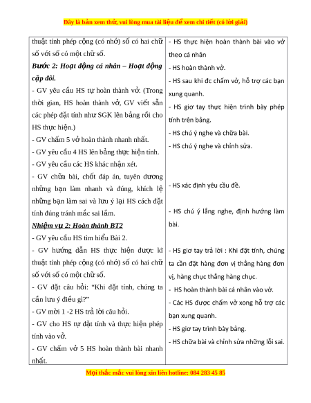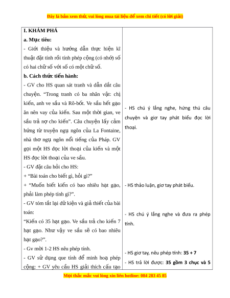 Đây là bản xem th , vu ử i lòng mua tài li u ệ đ xe ể m chi ti t (c ế ó l i ờ gi i ả ) I. KHÁM PHÁ a. Mục tiêu: - Gi i ớ thi u ệ và hư ng ớ d n ẫ th c ự hi n ệ kĩ thu t ậ đ t ặ tính r i ồ tính phép c ng ộ (có nh ) ớ số có hai ch s ữ ố v i ớ số có m t ộ ch s ữ ố. b. Cách th c t ứ i n hành: ế