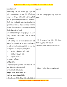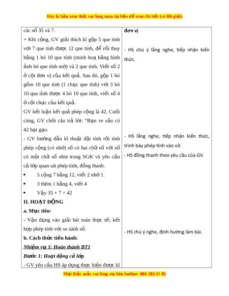 ớ quan sát phép tính, đồng thanh. 5 c ng 7 b ộ ng ằ 12, vi t ế 2 nh 1. ớ 3 thêm 1 b ng 4, vi ằ t ế 4 V y 35 + 7 = 42 ậ II. HOẠT Đ N Ộ G a. Mục tiêu: - V n ậ d ng ụ vào gi i ả bài toán th c ự t ; ế k t ế h p phép t ợ ính v i ớ so sánh s . ố