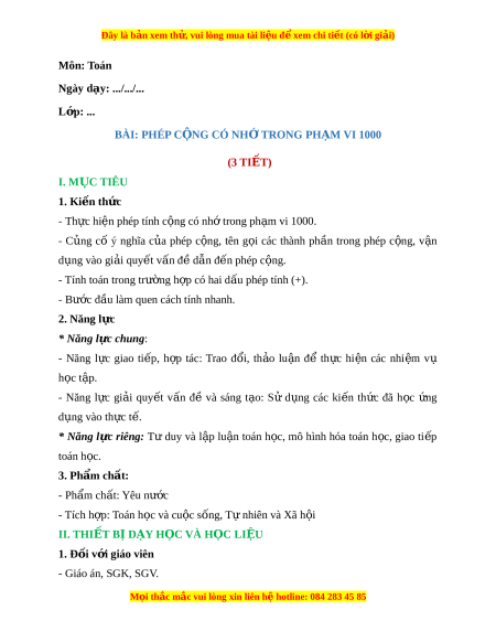 Ngày dạy: .../.../... L p: ớ ... BÀI: PHÉP C N Ộ G CÓ NH Ớ TRONG PH M Ạ VI 1000 (3 TI T Ế ) I. M C Ụ TIÊU 1. Ki n t ế h c ứ - Th c ự hi n phép ệ tính c ng ộ có nh t ớ rong ph m ạ vi 1000. - C ng ủ cố ý nghĩa c a ủ phép c ng, ộ tên g i ọ các thành ph n ầ trong phép c ng, ộ v n ậ d ng vào ụ gi i ả quy t ế v n đ ấ d ề n đ ẫ n phép c ế ng. ộ - Tính toán trong trư ng h ờ p ợ có hai d u phép t ấ ính (+). - Bư c ớ đ u l