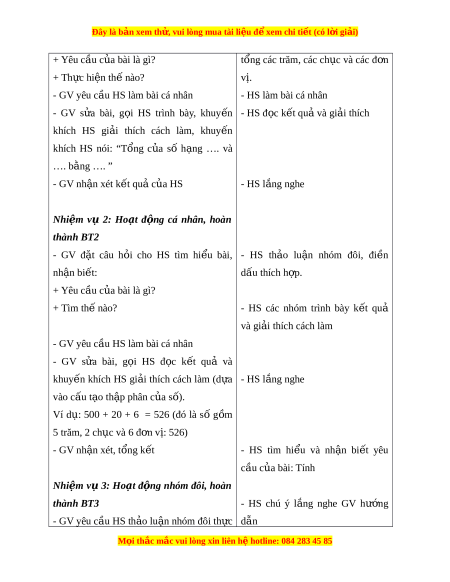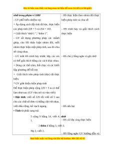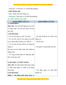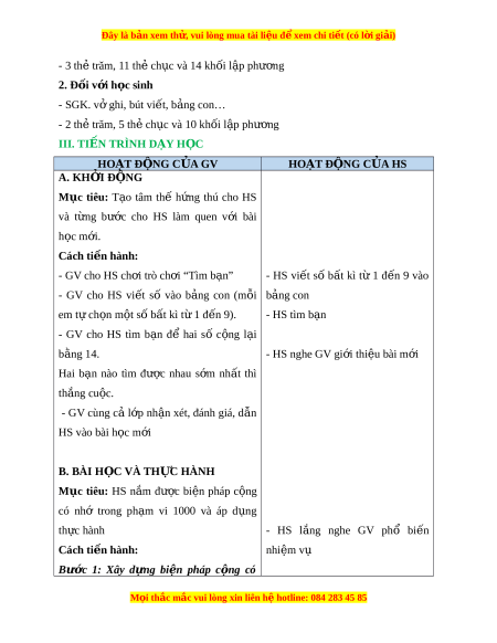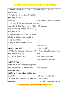 Đây là bản xem th , vu ử i lòng mua tài li u ệ đ xe ể m chi ti t (c ế ó l i ờ gi i ả ) - 3 th t ẻ răm, 11 th ch ẻ c và 14 kh ụ i ố l p ph ậ ư ng ơ 2. Đ i ố v i ớ h c s ọ inh - SGK. v ghi ở , bút vi t ế , b ng con… ả - 2 th t ẻ răm, 5 th ch ẻ c và ụ 10 kh i ố l p ậ phư ng ơ III. TI N Ế TRÌNH D Y Ạ H C Ọ HOẠT Đ N Ộ G C A Ủ GV HOẠT Đ N Ộ G C A Ủ HS A. KH I Ở Đ N Ộ G Mục tiêu: T o ạ tâm thế h ng ứ thú cho HS và t ng ừ bư c ớ cho HS làm quen v i ớ bài h c ọ m i ớ . Cách ti n hà ế nh: - GV cho HS ch i ơ trò ch i ơ “Tìm b n” ạ - HS vi t ế số b t ấ kì t ừ 1 đ n ế 9 vào - GV cho HS vi t ế số vào b ng ả con (m i ỗ b ng ả con em t ch ự n ọ m t ộ s b ố t ấ kì t 1 đ ừ n 9) ế . - HS tìm b n ạ - GV cho HS tìm b n ạ để hai số c ng ộ l i ạ b ng ằ 14. - HS nghe GV gi i ớ thi u bài ệ m i ớ Hai b n ạ nào tìm đư c ợ nhau s m ớ nh t ấ thì th ng ắ cu c. ộ - GV cùng cả l p ớ nh n ậ xét, đánh giá, d n ẫ HS vào bài h c ọ m i ớ B. BÀI H C Ọ VÀ TH C Ự HÀNH Mục tiêu: HS n m ắ đư c ợ bi n ệ pháp c ng ộ có nhớ trong ph m ạ vi 1000 và áp d ng ụ th c ự hành - HS l ng ắ nghe GV phổ bi n ế Cách ti n hà ế nh: nhiệm vụ