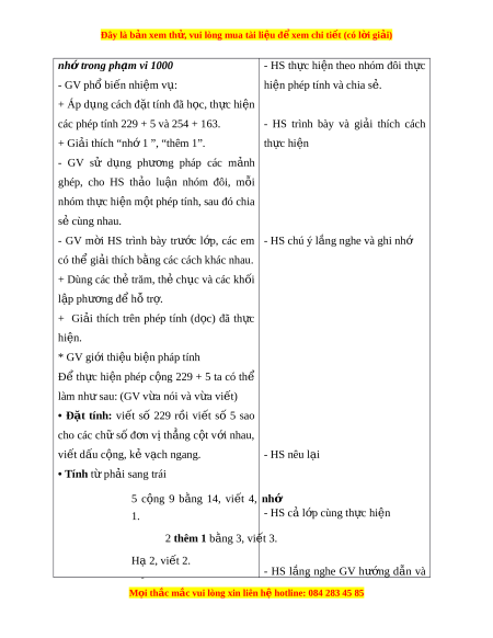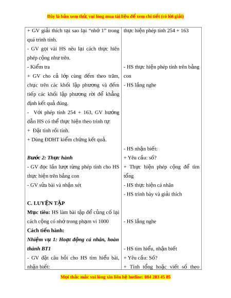 Đây là bản xem th , vu ử i lòng mua tài li u ệ đ xe ể m chi ti t (c ế ó l i ờ gi i ả ) + GV gi i ả thích t i ạ sao l i ạ “nhớ 1” trong th c ự hi n phép t ệ ính 254 + 163 quá trình tính. - GV g i ọ vài HS nêu l i ạ cách th c ự hiên phép c ng ộ nh t ư rên. - Ki m ể tra - HS th c ự hi n ệ phép tính trên b ng ả + GV cho cả l p ớ cùng đ m ế theo trăm, con ch c ụ trên các kh i ố l p ậ phư ng ơ và đ m ế - HS l ng nghe ắ ti p ế các kh i ố l p ậ phư ng ơ r i ờ để kh ng ẳ định k t ế quả đúng. - V i