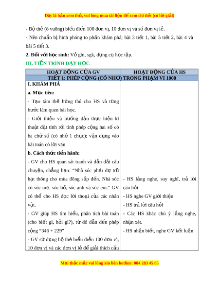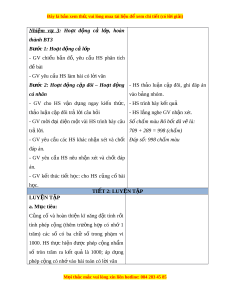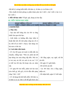 Đây là bản xem th , vu ử i lòng mua tài li u ệ đ xe ể m chi ti t (c ế ó l i ờ gi i ả ) - Bộ th ( ẻ ô vuông) bi u ể đi n ể 100 đ n v ơ , 10 đ ị n v ơ và s ị đ ố n v ơ l ị . ẻ - Nên chu n ẩ bị hình phóng to ph n ầ khám phá; bài 3 ti t ế 1, bài 5 ti t ế 2, bài 4 và bài 5 ti t ế 3. 2. Đ i ố v i ớ h c s ọ inh: V ghi ở , sgk, d ng c ụ h ụ c t ọ p. ậ III. TI N Ế TRÌNH D Y Ạ H C Ọ HOẠT Đ N Ộ G C A Ủ GV HOẠT Đ N Ộ G C A Ủ HS TIẾT 1: PHÉP C N Ộ G (CÓ NH ) Ớ TRONG PH M Ạ VI 1000 I. KHÁM PHÁ a. Mục tiêu: - T o ạ tâm thế h ng ứ thú cho HS và t ng ừ bư c ớ làm quen bài h c. ọ - Gi i ớ thi u ệ và hư ng ớ d n ẫ th c ự hi n ệ kĩ thu t ậ đ t ặ tính r i ồ tính phép c ng ộ hai số có