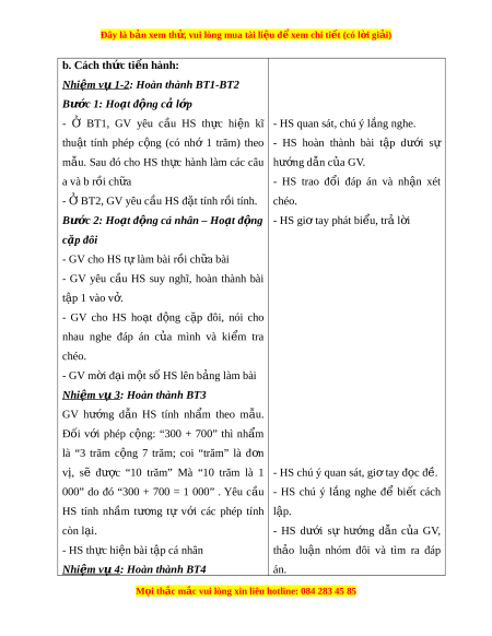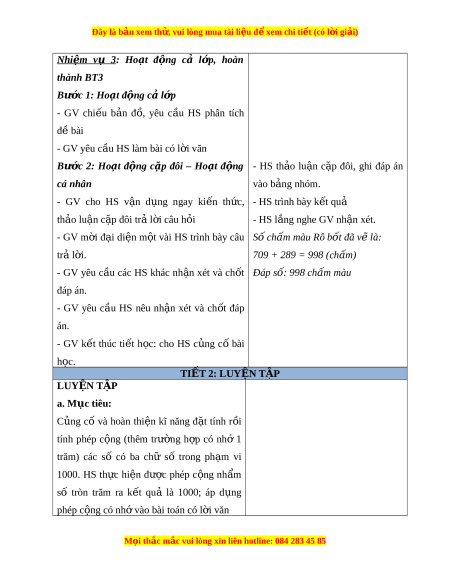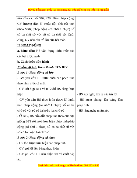 Đây là bản xem th , vu ử i lòng mua tài li u ệ đ xe ể m chi ti t (c ế ó l i ờ gi i ả ) t o ạ c a ủ các số 346, 229. Đ n ế phép c ng, ộ GV hư ng ớ d n ẫ kĩ thu t ậ đ t ặ tính r i ồ tính (theo SGK) phép c ng ộ (có nhớ 1 ch c) ụ số có ba chữ số v i ớ số có ba chữ s . ố Cu i ố cùng, GV nêu câu trả l i ờ c a bài ủ toán. II. HOẠT Đ N Ộ G a. M c ụ tiêu: HS v n ậ d ng ụ ki n ế th c ứ vào các bài th c hành. ự b. Cách th c ứ ti n hàn ế h Nhi m ệ v 1-