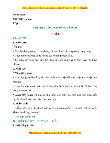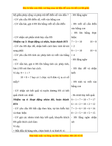 Ngày dạy: .../.../... L p: ớ ... BÀI: PHÉP C N Ộ G CÓ T N Ổ G B N Ằ G 10 (1 TIẾT) I. M C Ụ TIÊU 1. Ki n t ế h c ứ - Ôn t p: ậ + Tái hi n b ệ ng ả c ng có t ộ ng b ổ ng 10, t ằ h c hi ự n các ệ phép c ng t ộ rong b ng. ả + Th c ự hi n các ệ phép c ng không qua ộ l0 trong ph m ạ v 20. ị + Sử d ng ụ đồ dùng h c ọ t p, ậ thể hi n ệ số trong ph m ạ vi 20 (theo c u ấ t o ạ th p ậ phân). 2. Năng l c ự