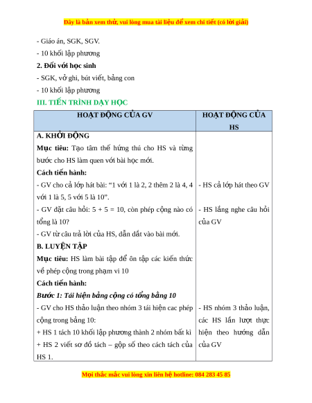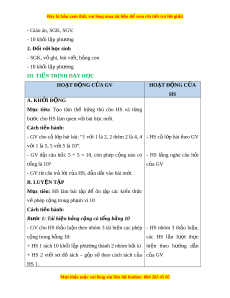 Đây là bản xem th , vu ử i lòng mua tài li u ệ đ xe ể m chi ti t (c ế ó l i ờ gi i ả ) - Giáo án, SGK, SGV. - 10 kh i ố l p ậ phư ng ơ 2. Đ i ố v i ớ h c s ọ inh - SGK, v ghi ở , bút vi t ế , b ng con ả - 10 kh i ố l p ậ phư ng ơ III. TI N Ế TRÌNH D Y Ạ H C Ọ HOẠT Đ N Ộ G C A Ủ GV HOẠT Đ N Ộ G C A Ủ HS A. KH I Ở Đ N Ộ G Mục tiêu: T o ạ tâm thế h ng ứ thú cho HS và t ng ừ bư c ớ cho HS làm quen v i ớ bài h c ọ m i ớ . Cách ti n hà ế nh: - GV cho c l ả p ớ hát bài: “1 v i