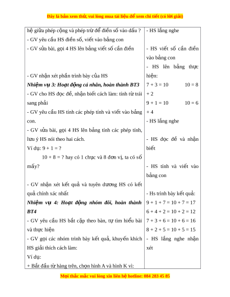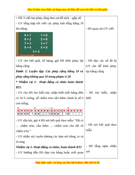 Đây là bản xem th , vu ử i lòng mua tài li u ệ đ xe ể m chi ti t (c ế ó l i ờ gi i ả ) + HS 3 vi t ế hai phép c ng ộ theo s đ ơ t ồ ách – g p s ộ ố - GV t ng ổ h p ợ r i ồ vi t ế các phép tính t ng ổ b ng ằ 10 lên b ng: ả - HS quan sát GV vi t ế - GV che k t ế qu , ả số h ng, ạ g i ọ HS khôi ph c ụ l i ạ - HS đ c ọ các số đã bị b ng ả c ng ộ GV che để khôi ph c ụ Bước 2: Luy n ệ t p: