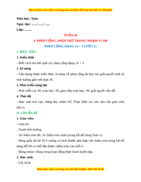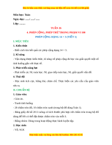 Ngày dạy: ....../ ....../ ...... L p: ớ ......... TUẦN 26 4. PHÉP C N Ộ G, PHÉP TR Ừ TRONG PH M Ạ VI 100 PHÉP C N Ộ G D N Ạ G 14 + 3 (TI T Ế 1) I. M C Ụ TIÊU 1. Ki n t ế h c ứ - Bi t ế cách tìm k t ế qu các ả phép c ng d ộ ng ạ 14 + 3. 2. Kĩ năng - V n ậ d ng ụ đư c ợ ki n ế th c, ứ kĩ năng v ề phép c ng ộ đà h c ọ vào gi i ả quy t ế m t ộ số tình huống g n v ắ i ớ th c ự t . ế 3. Phát tri n nă ể ng l c ự - Phát tri n các ể NL toán h c: ọ NL giao ti p t ế oán h c, ọ NL gi i ả quy t ế v n đ ấ . ề 4. Thái độ - H c ọ sinh tích c c, ự h ng ứ thú, chăm ch .ỉ Th c ự hi n ệ các yêu c u ầ c a ủ giáo viên nêu ra. II. CHUẨN BỊ 1. Giáo viên: - Giáo án. - Tranh tình huống. - 20 chấm tròn đ , 10 ch ỏ m ấ tròn xanh (trong b đ ộ dùng ồ Toán 1). - Băng gi y