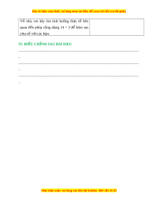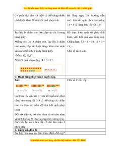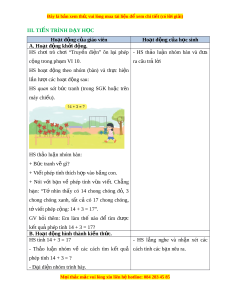 Đây là bản xem th , vu ử i lòng mua tài li u ệ đ xe ể m chi ti t (c ế ó l i ờ gi i ả ) III. TI N Ế TRÌNH D Y Ạ H C Ọ Hoạt đ ng c ộ a gi ủ áo viên Hoạt đ ng c ộ a h ủ c s ọ inh A. Hoạt đ ng k ộ h i ở đ ng. ộ HS ch i ơ trò ch i ơ “Truy n ề đi n” ệ ôn l i ạ phép - HS th o ả lu n ậ nhóm bàn và đ a ư c ng ộ trong ph m ạ VI 10. ra câu trả l i ờ HS ho t ạ đ ng ộ theo nhóm (bàn) và th c ự hi n ệ lần lư t ợ các ho t ạ đ ng s ộ au: HS quan sát b c ứ tranh (trong SGK ho c ặ trên máy chi u) ế . HS th o ả lu n nhóm ậ bàn: + B c ứ tranh v gì ẽ ? + Vi t ế phép tính thích h p ợ vào b ng con. ả + Nói v i ớ b n ạ về phép tính v a ừ vi t ế . Ch ng ẳ h n: ạ “Tớ nhìn th y ấ có 14 chong chóng đ , ỏ 3 chong chóng xanh, t t ấ cả có 17 chong chóng, t vi ớ t ế phép c ng: ộ 14 + 3 = 17”. GV h i