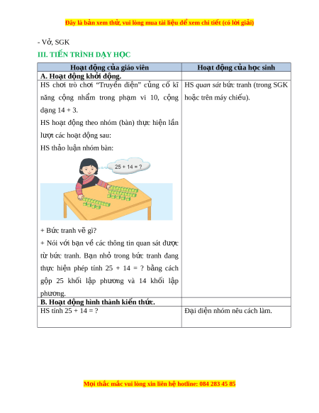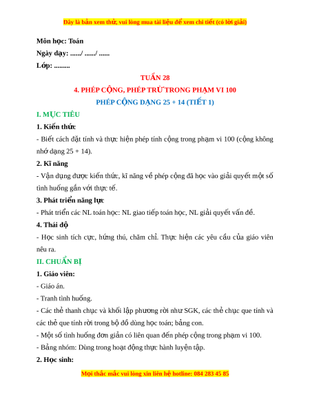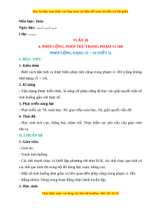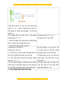 Ngày dạy: ....../ ....../ ...... L p: ớ ......... TUẦN 28 4. PHÉP C N Ộ G, PHÉP TR Ừ TRONG PH M Ạ VI 100 PHÉP C N Ộ G D N Ạ G 25 + 14 (TI T Ế 1) I. M C Ụ TIÊU 1. Ki n t ế h c ứ - Bi t ế cách đ t ặ tính và th c ự hi n ệ phép tính c ng ộ trong ph m ạ vi 100 (c ng ộ không nhớ d ng 25 + 14) ạ . 2. Kĩ năng - V n ậ d ng ụ đư c ợ ki n ế th c, ứ kĩ năng v ề phép c ng ộ đã h c ọ vào gi i ả quy t ế m t ộ số tình huống g n v ắ i ớ th c ự t . ế 3. Phát tri n nă ể ng l c ự - Phát tri n các ể NL toán h c: ọ NL giao ti p t ế oán h c, ọ NL gi i ả quy t ế v n đ ấ . ề 4. Thái độ - H c ọ sinh tích c c, ự h ng ứ thú, chăm ch .ỉ Th c ự hi n ệ các yêu c u ầ c a ủ giáo viên nêu ra. II. CHUẨN BỊ 1. Giáo viên: - Giáo án. - Tranh tình huống. - Các thẻ thanh ch c ụ và kh i ố l p ậ phư ng ơ r i ờ nh ư SGK, các th ẻ ch c ụ que tính và các th que t ẻ ính r i ờ trong b đ ộ dùng h ồ c t ọ oán; b ng ả con. - M t ộ số tình huống đ n gi ơ n ả có liên quan đ n phép ế c ng t ộ rong ph m ạ vi 100. - B ng ả nhóm: Dùng trong ho t ạ đ ng t ộ h c hành l ự uy n t ệ p. ậ 2. H c ọ sinh: M i