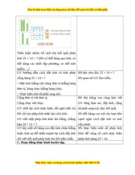 ộ phép tính khác lên b ng, ả ch ng ắ c nh ạ nghe cách đ t ặ tính và tính h n ạ 24 + 12 = ? c a m ủ ình. GV l y ấ m t ộ số b ng ả con đ t ặ tính ch a ư th ng ẳ HS th c ự hi n ệ m t ộ số phép tính ho c ặ tính sai để nh n ấ m nh ạ l i ạ cách đ t ặ tính khác để c ng ủ cố cách th c ự hi n ệ r i ồ vi t ế k t ế qu phép t ả ính cho HS n m ắ ch c. ắ phép tính d ng 25 + 14. ạ C. Hoạt đ ng t ộ h c hành l ự uy n t ệ p. ậ M i