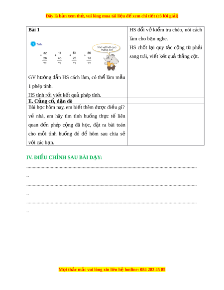 Đây là bản xem th , vu ử i lòng mua tài li u ệ đ xe ể m chi ti t (c ế ó l i ờ gi i ả ) Bài 1 HS đ i ổ vở ki m ể tra chéo, nói cách làm cho b n nghe. ạ HS ch t ố l i ạ quy t c ắ c ng ộ từ ph i ả sang trái, vi t ế k t ế quả th ng c ẳ t ộ . GV hư ng ớ d n ẫ HS cách làm, có th ể làm m u ẫ 1 phép tính. HS tính r i ồ vi t ế k t ế qu phép t ả ính. E. C ng c ủ , ố d n dò ặ Bài h c hôm ọ nay, em bi t ế thêm đư c ợ đi u gì ề ?