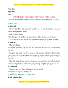 Ngày dạy: ....../......./...... L p: ớ ... CH Đ Ủ Ề: PHÉP C N Ộ G, PHÉP TR Ừ TRONG PH M Ạ VI 1000 BÀI 59: PHÉP C N Ộ G (KHÔNG NH ) Ớ TRONG PH M Ạ VI 1000 (2 TI T Ế ) I. M C Ụ TIÊU 1. Ki n t ế h c ứ - HS th c ự hi n ệ đư c ợ phép c ng ( ộ không nh ) ớ s ố có ba ch ữ s có ố ba, hai ho c ặ m t ộ chữ số (trong ph m ạ vi 1000): + Đtặ tính theo c t ộ d c; ọ + T ph ừ i ả qua trái, l n l ầ ư t ợ c ng ộ hai s đ ố n v ơ , hai ị s ch ố c ụ và hai s t ố ram - Gi i ả đư c ợ các bài toán th c ự t l ế iên quan đ n phép c ế ng ộ trong ph m ạ vi đã h c ọ 2. Năng l c: ự - Năng l c ự chung: + Năng l c ự giao ti p, ế h p ợ tác: Trao đ i ổ , th o ả lu n ậ để th c ự hi n ệ các nhi m ệ vụ h c ọ t p. ậ + Năng l c ự gi i ả quy t ế v n ấ đ ề và sáng t o: ạ S ử d ng ụ các ki n ế th c ứ đã h c ọ nh m ằ gi i ả quy t