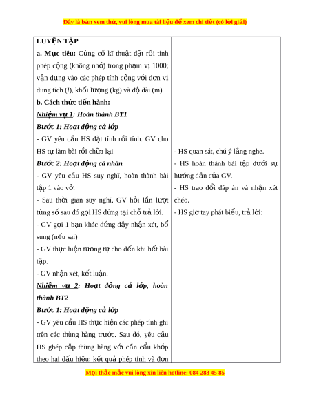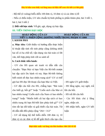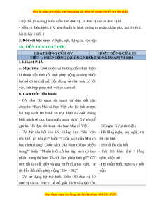 Đây là bản xem th , vu ử i lòng mua tài li u ệ đ xe ể m chi ti t (c ế ó l i ờ gi i ả ) - Bộ th ( ẻ ô vuông) bi u ể di n ễ 100 đ n v ơ , 10 đ ị n v ơ và các đ ị n ơ v l ị ẻ - N u ế có đi u ề ki n, ệ GV nên chu n ẩ b ịhình ph ng ố to ph n ầ khám phá, bài 3 ti t ế 1, bài 2, bài 5 ti t ế 2 2. Đ i ố v i ớ h c s ọ inh: V ghi ở , sgk, d ng c ụ h ụ c t ọ p. ậ III. TI N Ế TRÌNH D Y Ạ H C Ọ HOẠT Đ N Ộ G C A Ủ GV HOẠT Đ N Ộ G C A Ủ HS TI T Ế 1: PHÉP C N Ộ G (KHÔNG NH ) Ớ TRONG PH M Ạ VI 1000 I. KHÁM PHÁ a. M c ụ tiêu: Gi i ớ thi u ệ và hư ng ớ d n ẫ th c ự hi n ệ kĩ thu t ậ đ t ặ tính r i ồ tính phép c ng ộ (không nh ) ớ hai số có ba chữ s ; ố v n ậ d ng ụ vào bài toán có l i ờ văn, k t ế h p phép t ợ ính v i ớ so sánh số b. Cách th c ứ ti n hàn ế h: