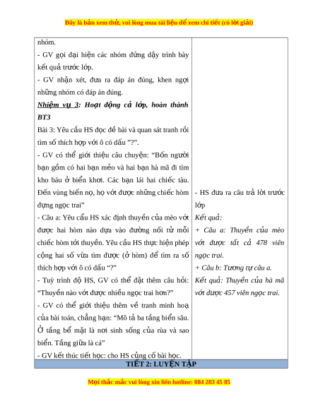 ề bài và quan sát tranh r i ồ tìm số thích h p v ợ i ớ ô có d u ”?”. ấ - GV có thể gi i ớ thi u ệ câu chuy n: ệ “B n ố ngư i ờ b n ạ gồm có hai b n ạ m o ẻ và hai b n ạ hà mã đi tìm kho báu ở bi n ể kh i ơ . Các b n ạ lái hai chi c ế tàu. Đ n ế vùng bi n ế n , ọ h ọ v t ớ đư c ợ nh ng ữ chi c ế hòm - HS đ a ư ra câu trả l i ờ trư c ớ đ ng ng ự c ọ trai” l p ớ - Câu a: Yêu c u ẩ HS xác đ nh ị thuy n ề c a ủ mèo v t ớ K t ế qu : ả đư c ợ hai hòm nào d a ự vào đư ng ờ n i ố tử m i ỗ + Câu a: Thuy n ề c a ủ mèo chi c ế hòm t i ớ thuy n. ề Yêu c u ầ HS th c ự hi n ệ phép v t ớ đư c ợ t t ấ cả 478 viên c ng ộ hai số v a ừ tìm đư c