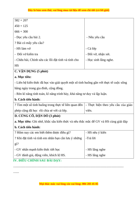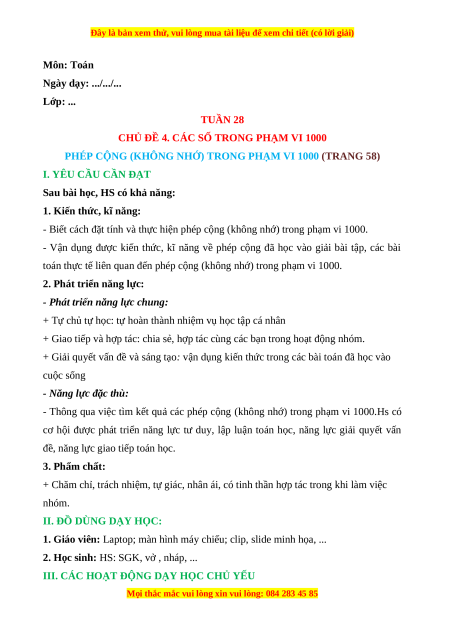- Biết cách đặt tính và thực hiện phép cộng (không nhớ) trong phạm vi 1000.
