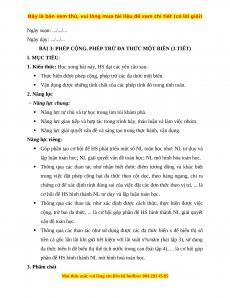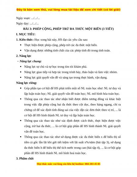 BÀI 3: PHÉP CỘNG, PHÉP TRỪ ĐA THỨC MỘT BIẾN (3 TIẾT) I. MỤC TIÊU: