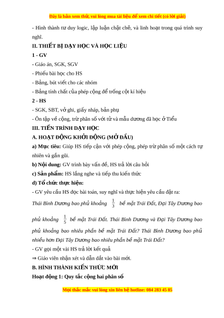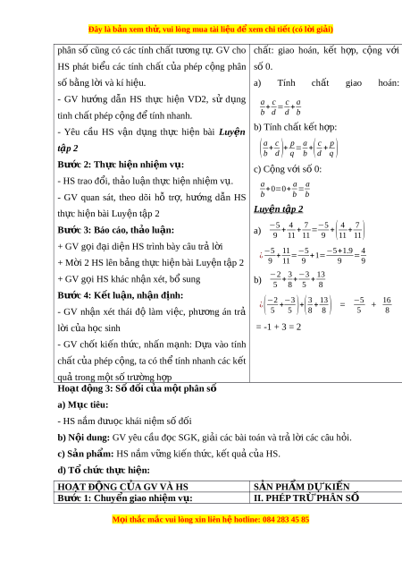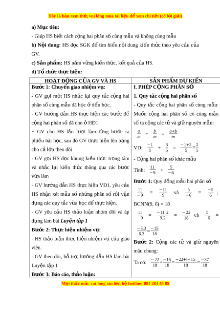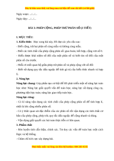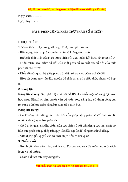 Đây là bản xem th , vu ử i lòng mua tài li u ệ đ xe ể m chi ti t ế (có l i ờ gi i ả ) Ngày so n: ạ .../.../... Ngày d y: ạ .../.../... BÀI 3: PHÉP C N Ộ G, PHÉP TR P Ừ HÂN S ( Ố 3 TI T Ế ) I. M C Ụ TIÊU: 1. Ki n t ế h c ứ : H c ọ xong bài này, HS đ t ạ các yêu c u s ầ au: - Bi t ế c ng, t ộ r hai ừ