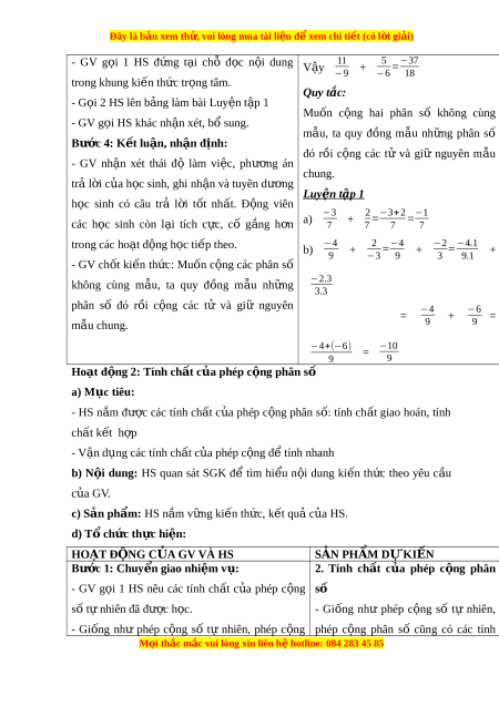 ậ xét thái độ làm vi c, ệ phư ng ơ án chung. trả l i ờ c a ủ h c ọ sinh, ghi nh n ậ và tuyên dư ng ơ Luy n t ệ ập 1 h c ọ sinh có câu trả l i ờ t t ố nh t ấ . Đ ng ộ viên 2 −3+2 −1 các h c ọ sinh còn l i ạ tích c c, ự cố g ng ắ h n ơ a) −3 + = = 7 7 7 7 trong các ho t ạ đ ng h ộ c ọ ti p t ế heo. 2 b) −4 + −4 −4.1 = + −2= + 9 −3 9 3 9.1 - GV ch t ố ki n ế th c ứ : Muốn c ng ộ các phân số không cùng m u, ẫ ta quy đ ng ồ m u ẫ nh ng ữ −2.3 3.3 phân số đó r i ồ c ng