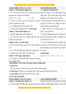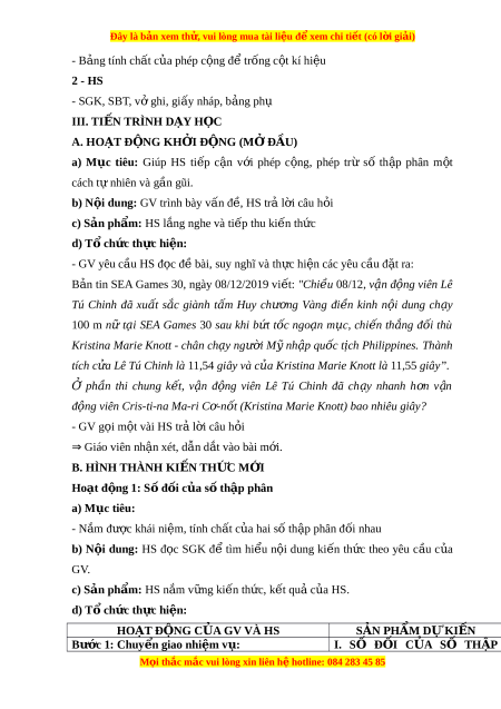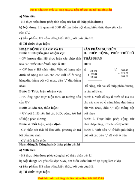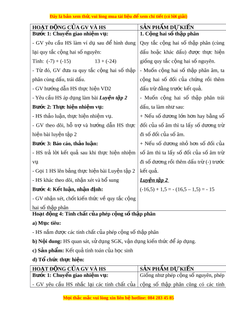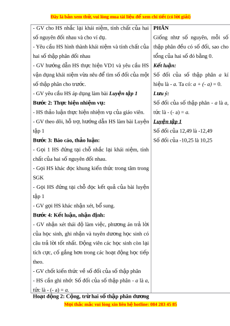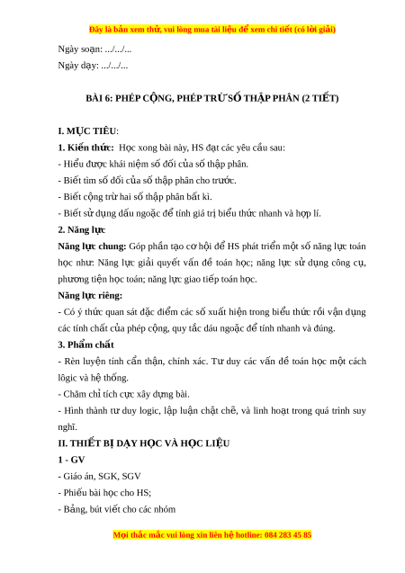 Đây là bản xem th , vu ử i lòng mua tài li u ệ đ xe ể m chi ti t ế (có l i ờ gi i ả ) Ngày so n: ạ .../.../... Ngày d y: ạ .../.../... BÀI 6: PHÉP C N Ộ G, PHÉP TR S Ừ Ố TH P Ậ PHÂN (2 TI T Ế ) I. M C Ụ TIÊU: 1. Ki n t ế h c ứ : H c ọ xong bài này, HS đ t ạ các yêu c u s ầ au: - Hi u đ ể ược khái ni m ệ số đối c a s ủ ố th p ậ phân. - Bi t ế tìm số đối c a ủ s t ố h p phân ậ cho trư c. ớ - Bi t ế c ng t ộ r hai ừ số th p ậ phân b t ấ kì. - Bi t ế s d ử ng ụ d u ngo ấ ặc đ t ể ính giá tr bi ị u t ể h c ứ nhanh và h p l ợ í. 2. Năng l c ự Năng l c ự chung: Góp ph n ầ t o ạ c ơ h i ộ đ ể HS phát tri n ể m t ộ s ố năng l c ự toán h c ọ nh : ư Năng l c ự gi i ả quy t ế v n ấ đề toán h c; ọ năng l c ự sử d ng ụ công c , ụ phư ng t ơ i n h ệ c t ọ oán; năng l c ự giao ti p t ế oán h c. ọ Năng l c ự riêng: - Có ý th c ứ quan sát đ c ặ đi m ể các số xu t ấ hi n ệ trong bi u ể th c ứ r i ồ v n ậ d ng ụ các tính chất c a phép ủ c ng, quy t ộ c ắ dáu ngo c đ ặ ể tính nhanh và đúng. 3. Ph m ẩ chất - Rèn luy n ệ tính c n ẩ th n,