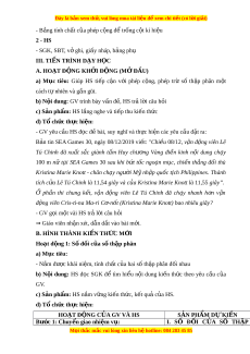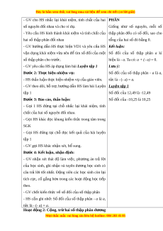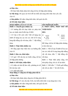 ớ 3: Báo cáo, th o l ả u n: ậ c t ộ v i ớ nhau, d u ấ “,” đ t ặ th ng ẳ c t ộ + GV g i ọ 1 HS nêu l i ạ các bư c ớ c ng, ộ trừ hai v i ớ nhau số th p phân ậ dư ng ơ Bư c ớ 2. Th c ự hi n ệ phép c ng, ộ trừ Bư c ớ 4: K t ế lu n, nh ậ n đ ậ nh: ị nh phép c ư ng, ộ tr các ừ số t nhi ự ên - GV nh n ậ xét thái đ ộ làm vi c, ệ phư ng ơ án trả Bư c ớ 3. Vi t ế d u ấ “,” ở k t ế quả th ng ẳ l i ờ c a h ủ c ọ sinh c t ộ v i ớ các d u “,” đã vi ấ t ế t ở rên. - GV chốt ki n t ế h c ứ Hoạt đ ng ộ 3: C ng hai ộ số th p p ậ hân b t ấ kì a) M c t ụ iêu: - HS th c hi ự n đ ệ ư c ợ phép c ng hai ộ số th p phân b ậ t ấ kì b) N i