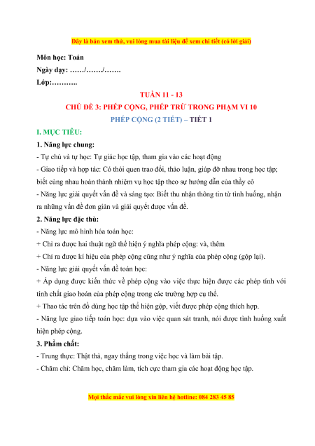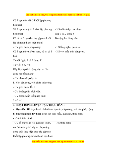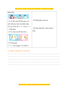- Năng lực giao tiếp toán học: dựa vào việc quan sát tranh, nói được tình huống xuất hiện phép cộng. 3. Phẩm chất: