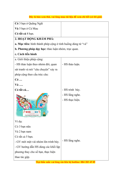 Đây là bản xem thử, vui lòng mua tài liệu để xem chi tiết (có lời giải) Có 3 bạn ở Quãng Ngãi Và 5 bạn ở Cà Mau Có tất cả 8 bạn. 2. HOẠT ĐỘNG KHÁM PHÁ:
