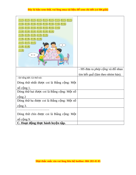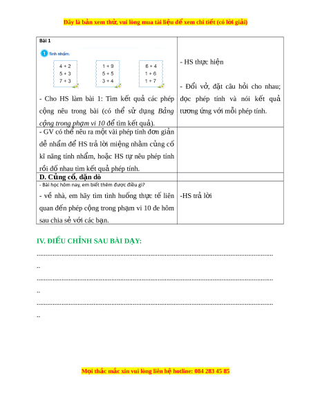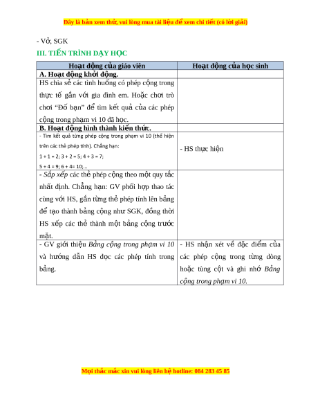 Đây là bản xem th , vu ử i lòng mua tài li u ệ đ xe ể m chi ti t (c ế ó l i ờ gi i ả ) - V , ở SGK III. TI N Ế TRÌNH D Y Ạ H C Ọ Hoạt đ ng c ộ a gi ủ áo viên Hoạt đ ng c ộ a h ủ c s ọ inh A. Hoạt đ ng k ộ h i ở đ ng. ộ HS chia sẻ các tình hu ng ố có phép c ng ộ trong th c ự tế g n ắ v i ớ gia đình em. Ho c ặ ch i ơ trò ch i ơ “Đố b n” ạ để tìm k t ế quả c a ủ các phép c ng ộ trong ph m ạ vi 10 đã h c. ọ B. Hoạt đ ng hì ộ nh thành ki n t ế h c. ứ